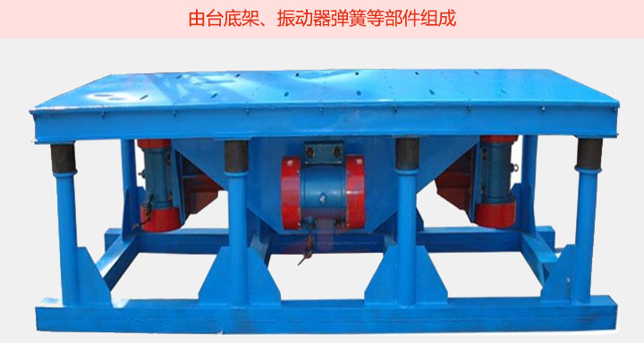 混凝土振動(dòng)平臺(tái)主要由臺(tái)底架,振動(dòng)器彈簧等部件組成,臺(tái)面與底架均用鋼板和型鋼焊接而成,振動(dòng)臺(tái)是用電動(dòng)機(jī)加一對(duì)相同的偏心論組成。并通過(guò)一對(duì)吊架聯(lián)軸器安裝在臺(tái)面中心位置,起著振實(shí)過(guò)程中平穩(wěn),垂直方向的作用。